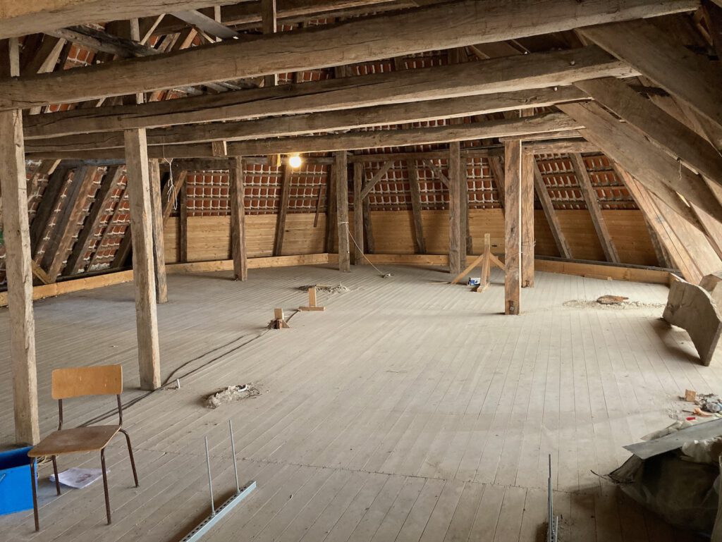 Nach einer kleinen Fragerunde an den Architekten und einem Blick in den Container gab es noch eine Führung über den Dachboden der Kirche. Dort konnte man auch erkennen, wie die sehr langen, roten Deckenbalken, die man im Kircheninnern über sich erkennt, in der Mitte noch einmal abgefangen werden. An einigen Stellen sind die Halterungen sogar von unten erkennbar.