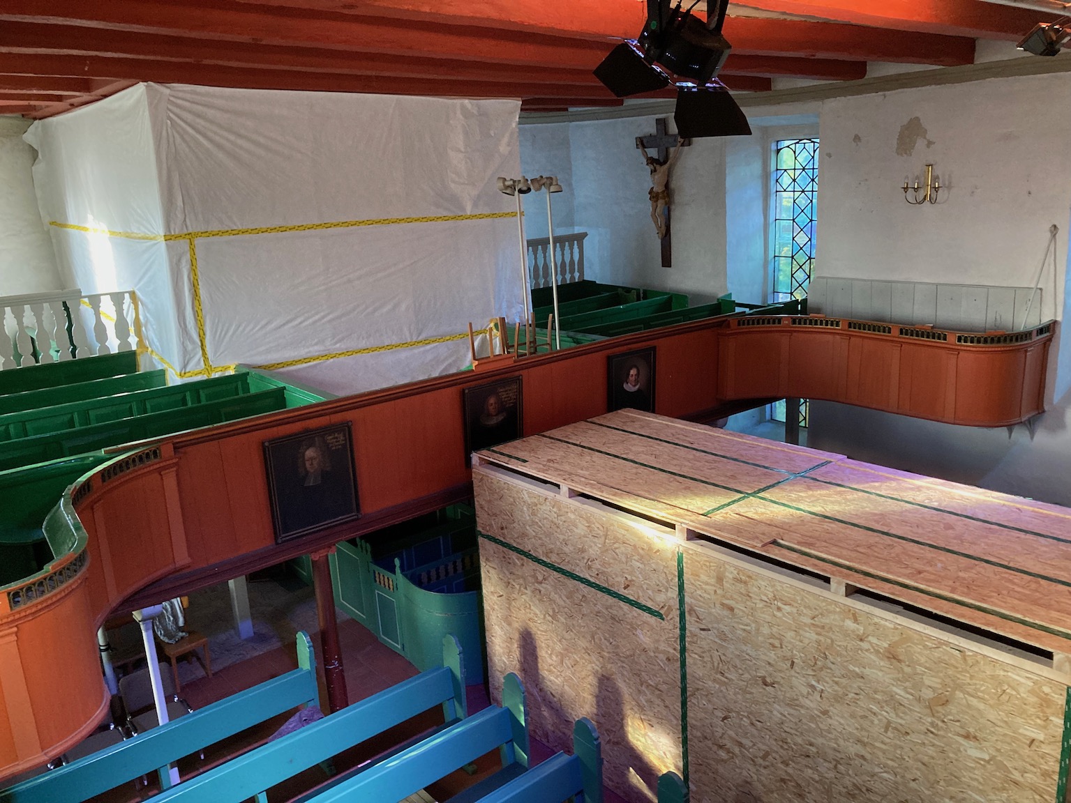 Seit Mitte November des letzten Jahres ist die Kirche eingerüstet und seither wird nach dem Sanierungskonzept unter dem Dach gearbeitet. Dazu wurden die Schindeln über dem Traufrand abgedeckt und das Dach mit einem Folienkranz abgedichtet. Für die Arbeiten auf dem Dachboden hat es den Vorteil, dass bei Tageslicht gearbeitet werden kann. Hier werden also Schäden am Balkenwerk, am Bodenbelag und am Mauerwerk des Traufrands behoben. Das Ziel ist also, den Bau von oben her dicht und trocken herzustellen. Die Arbeiten am äußeren Mauerwerk können erst im Frühjahr bei Temperaturen beständig über 5°C in Angriff genommen, da zur fachgerechten Sanierung ein besonderer Mörtel eingesetzt werden muss. Erst danach wird der Sockel trocken gelegt.