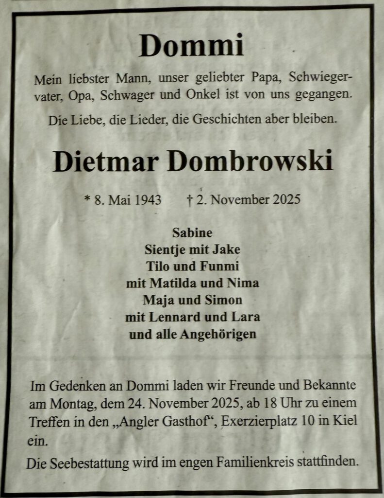Dietmar Dombrowski, kurz Dommi, hat im Barkauer Land seine Spur mit Liebe für den Nächsten, mit Liedern für die Freiheit und mit Geschichten von Zuversicht hinterlassen. Wir trauern mit seiner Frau Bine und der Familie und behalten die Erinnerung an Dommi in unseren Herzen.